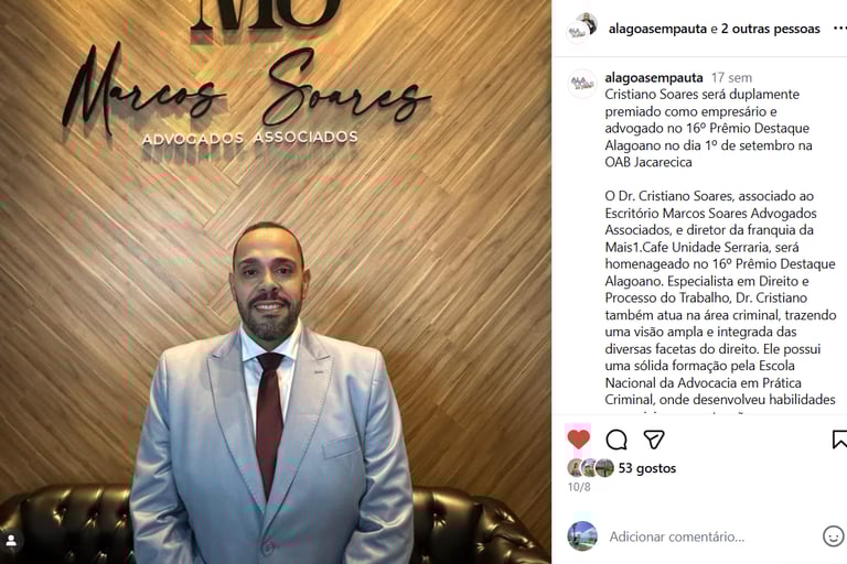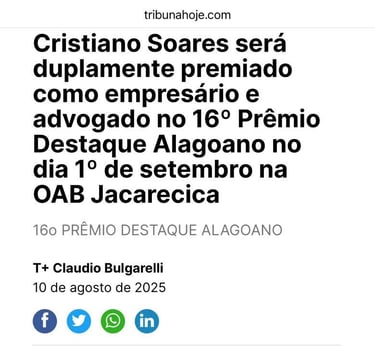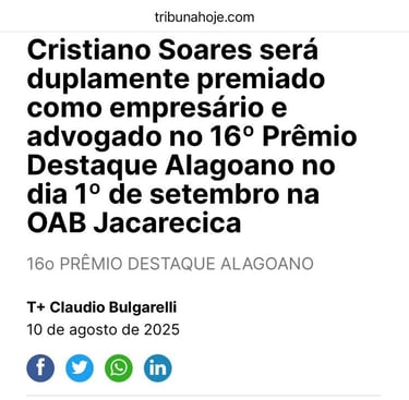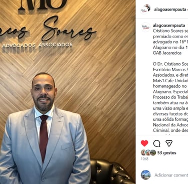 O Dr. Cristiano Soares, associado ao Escritório Marcos Soares Advogados Associados será homenageado no 16º Prêmio Destaque Alagoano. Especialista em Direito e Processo do Trabalho...
